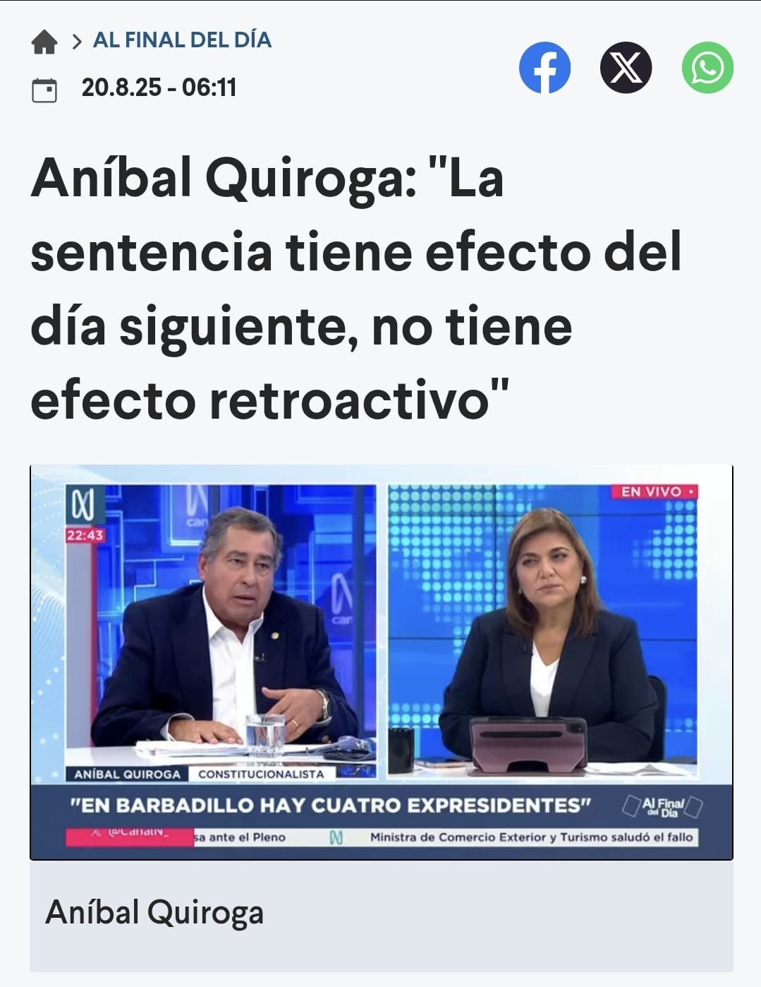 Aníbal Quiroga: Nadie debería ser perseguido por algo que no es delito Video de entrevista en N Portada- Canal N