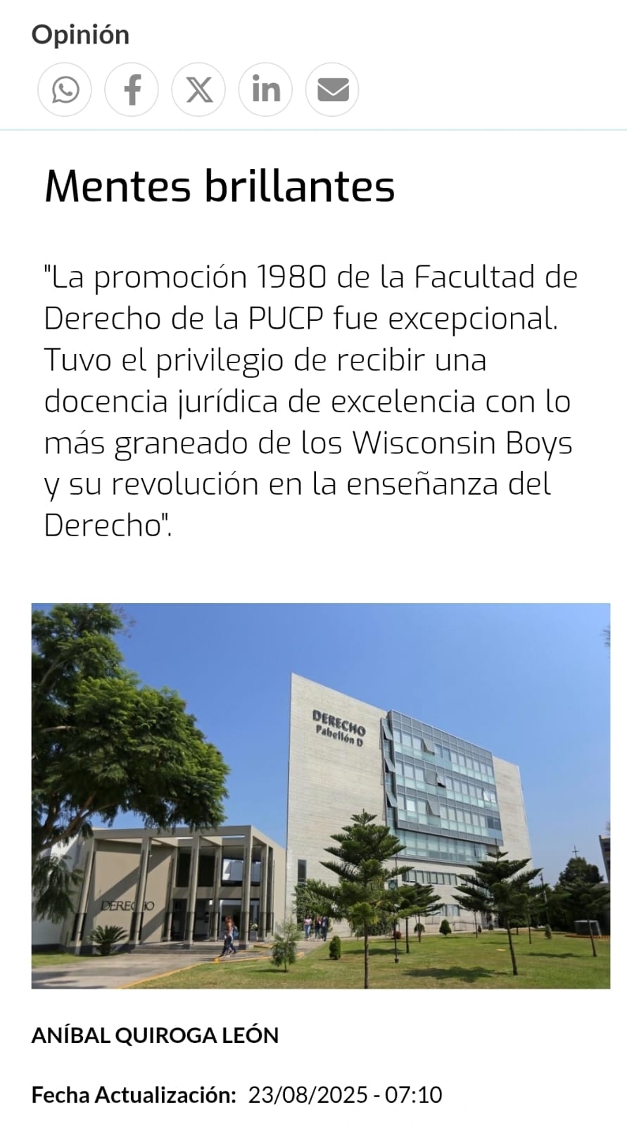 La promoción 1980 de la Facultad de Derecho de la PUCP fue excepcional. Tuvo el privilegio de recibir una docencia jurídica de excelencia con lo más graneado de los Wisconsin Boys y su revolución en la enseñanza del Derecho. Profesores con gran mística pese a las carencias materiales de entonces. Eran brillantes. Muchos ni cobraban su paga. Tenían compromiso. Era un privilegio ser profesor en Derecho. En la actualidad la gratitud a los antiguos profesores no es moneda corriente.