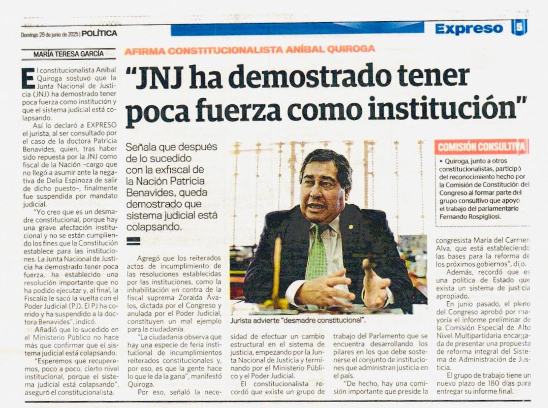 Así lo declaró a EXPRESO el jurista, al ser consultado por el caso de la doctora Patricia Benavides, quien, tras haber sido repuesta por la JNJ como fiscal de la Nación –cargo que no llegó a asumir ante la negativa de Delia Espinoza de salir de dicho puesto–, finalmente fue suspendida por mandato judicial.