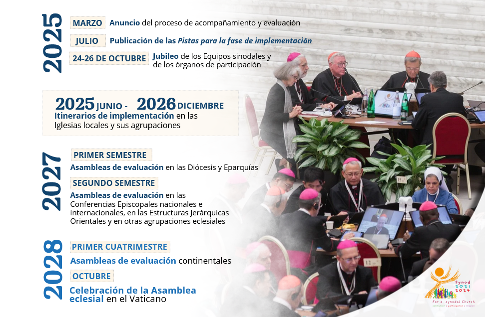 - Junio de 2025 – diciembre de 2026: itinerarios de implementación en las Iglesias locales y sus agrupaciones;