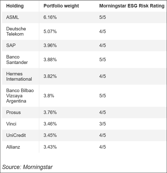 El índice de la eurozona comparte el mismo objetivo y estrategia de inversión que su equivalente estadounidense. La ficha técnica indica que habría proporcionado a los inversores una rentabilidad anualizada del 14,11 % en el último año y del 9,03 % en los últimos diez años. No obstante, su desempeño habría sido inferior al índice de referencia de Morningstar para empresas de mediana y gran capitalización de la eurozona. A continuación, se presenta una lista de sus principales componentes: