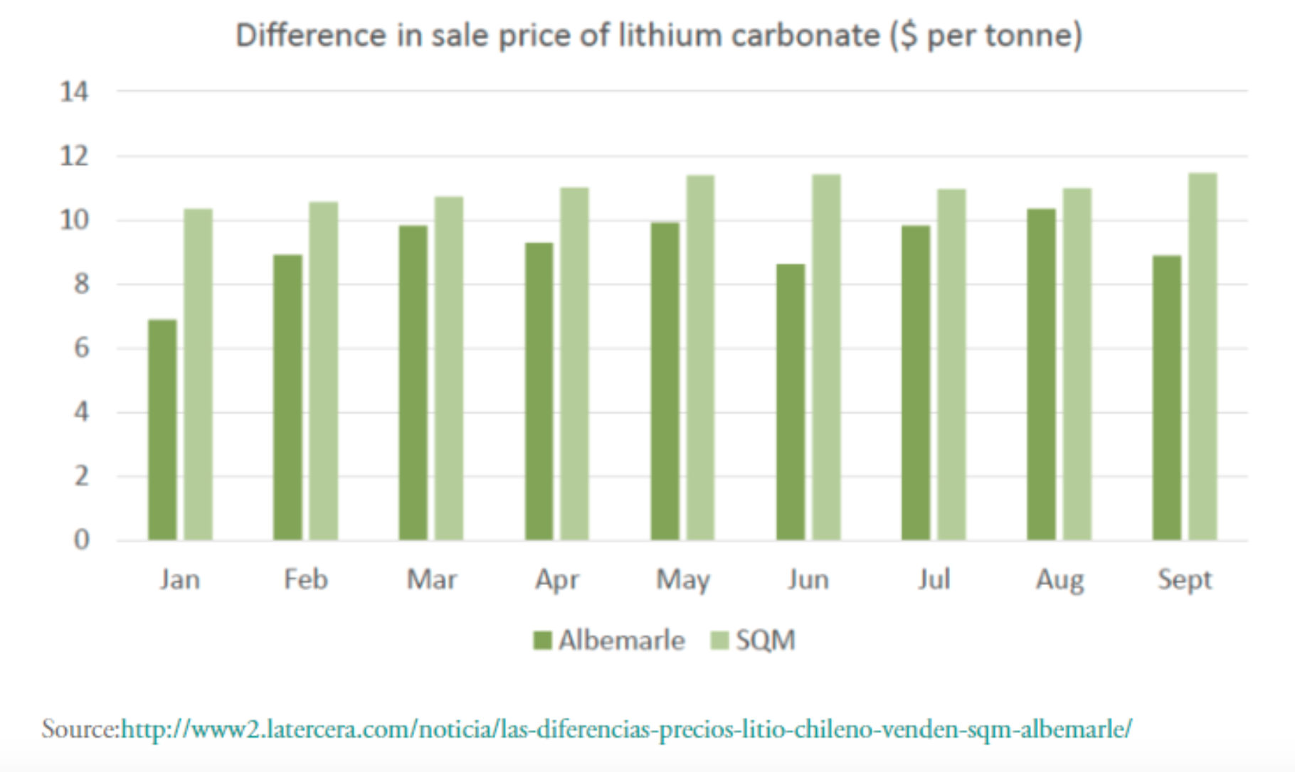 El tema se ha convertido en un tema candente en Chile. Usando los datos de las agencias de aduanas, los académicos y los medios de comunicación identificaron una diferencia de US$1800 en promedio entre los precios de venta de Albemarle y SQM para el carbonato de litio en 2017. Los datos de la Comisión Chilena del Cobre respaldan esta conclusión. Confirman que en 2017 el precio promedio para las exportaciones totales de litio (carbonato, óxido y cloruro) fue de $11 169 y $8 984 para SQM y Albermarle respectivamente (es decir, el precio de Albermarle fue inferior en $2185).