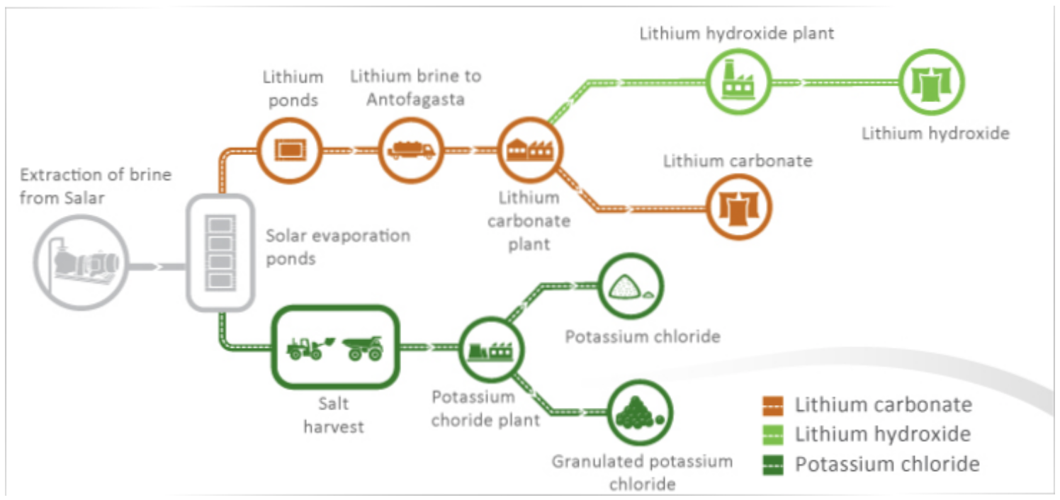 SQM procesa su litio antes de su exportación desde Chile. Primero, la salmuera se bombea a las piscinas de evaporación donde el sol la concentra en una solución grasa de color amarillo. La solución se transfiere luego a la planta de producción de Salar del Carmen, donde se purifica y se trata con carbonato de sodio para producir carbonato de litio. Finalmente, el carbonato de litio se filtra, se seca y se empaqueta para su envío. El valor se agrega al producto final y así “el impuesto sobre este valor agregado se mantiene en Chile”, dice una fuente en una declaración traducida.