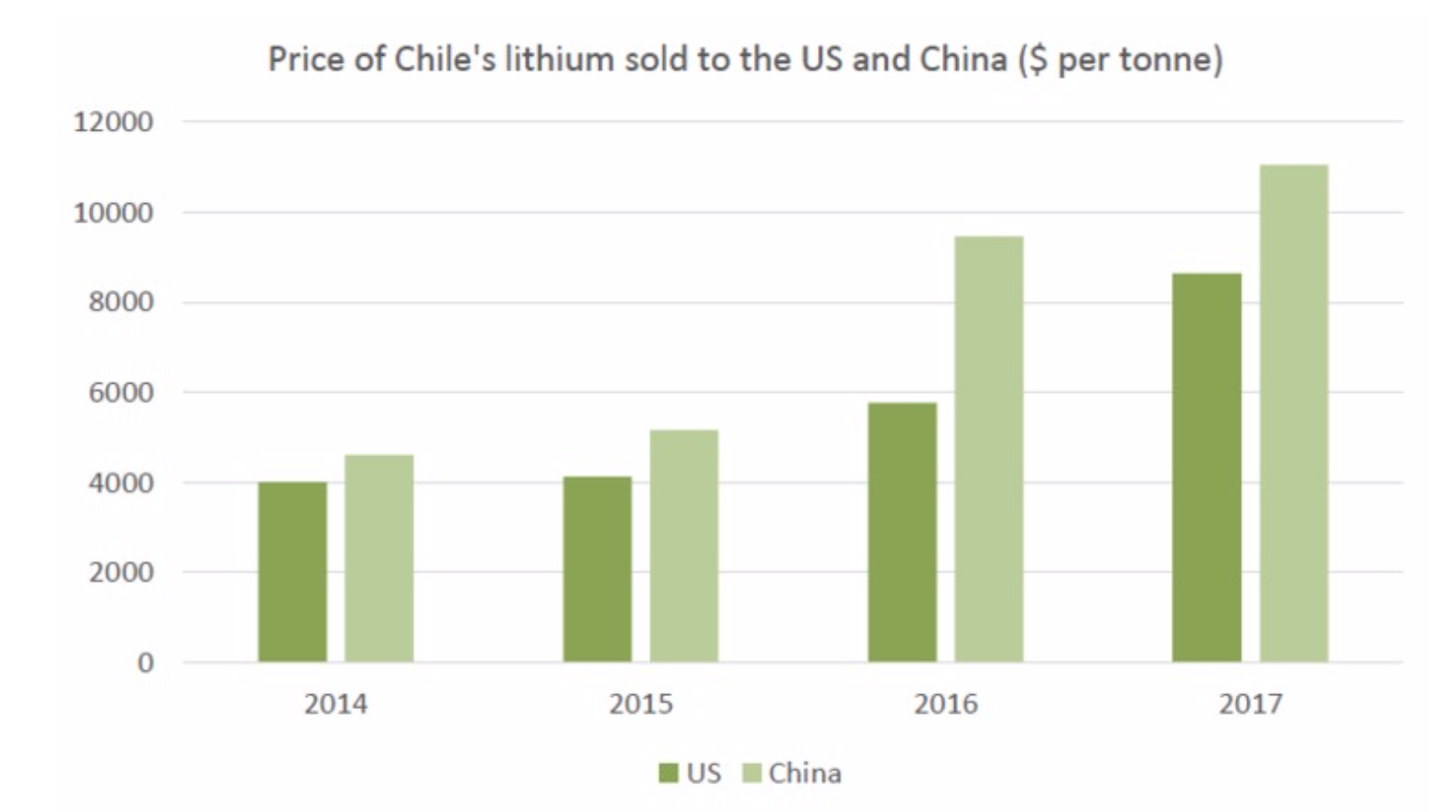 Según los datos comerciales, el valor del carbonato de litio de Chile exportado a los EE. UU. es de $1700 menos en promedio que el litio que se envía a China. Esto sugiere que el precio implícito del carbonato de litio vendido a entidades con sede en los Estados Unidos está muy por debajo del precio recibido en las ventas de litio a China. La variación podría deberse a que las compañías chinas pagan más por el litio para controlar la cadena de suministro del vehículo eléctrico, más el costo adicional de envío y transporte. También hay menos producción de cátodos en los EE. UU, lo que significa menores importaciones de litio de grado de batería y menores valores comerciales.