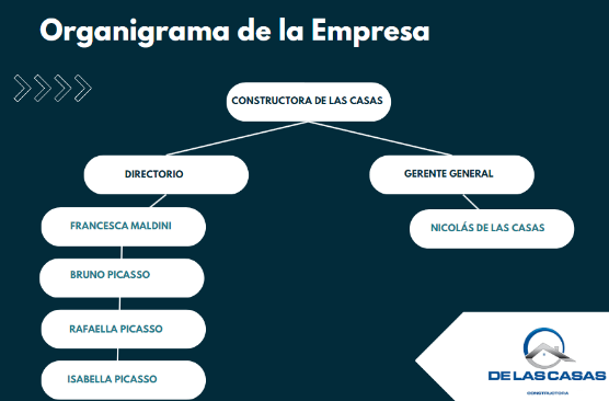 En principio, tenemos el siguiente gráfico que nos muestra la conformación de la Constructora De Las Casas en el año 2015, empresa que posee como actividad principal la construcción de proyectos inmobiliarios, en donde se produjo una situación de quiebra de la empresa, resultado de la gestión del Gerente General.