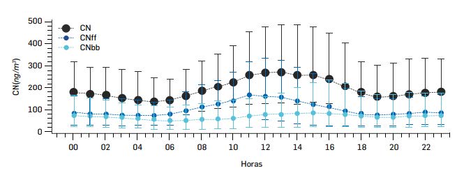 Por otro lado, en horas nocturnas se presenta una segunda moda sumamente ligera centrada entre las 22 y 00 horas, y las magnitudes de los componentes son similares, por lo que se puede señalar que durante la noche el aporte al CN total provienen de ambos.