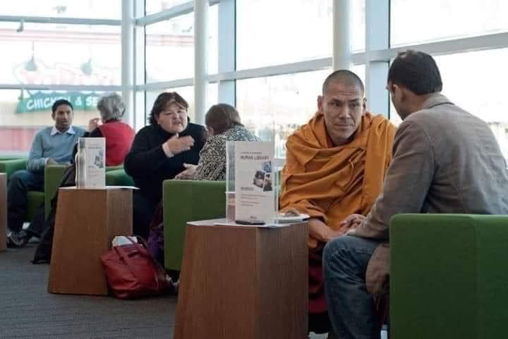 Imagen: Human library: personas solitarias, pagan por poder conversar con otra persona. La Biblioteca Humana (Human Library) es un movimiento internacional, nacido en Dinamarca en el 2000, que promueve el diálogo y la empatía al “prestar” personas en lugar de libros. Voluntarios con experiencias de vida marcadas por prejuicios o estereotipos (como minorías, profesiones estigmatizadas, o historias de superación) comparten sus historias reales con lectores en conversaciones honestas, buscando combatir la discriminación y fomentar la comprensión social. https://www.bibliotecahumanalh.com/es/que-es-la-biblioteca-humana