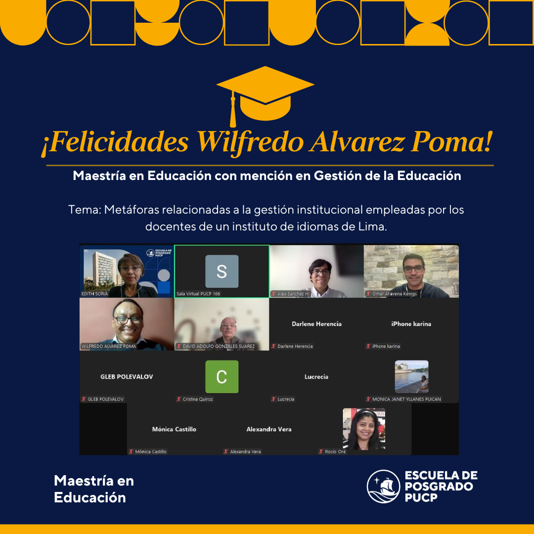 Felicitamos al Sr. Wilfredo Alvarez Poma por haberse graduado de Maestro en Educación con mención en Gestión de la Educación. Él defendió la tesis titulada “Metáforas relacionadas a la gestión institucional empleadas por los docentes de un instituto de idiomas de Lima.”