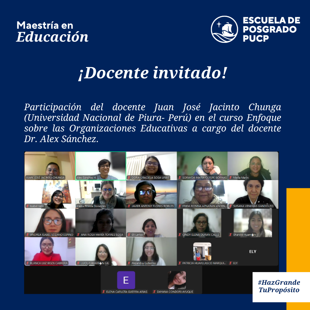 Participación de docente internacional en el curso Enfoque sobre las organizaciones educativas a cargo del docente Dr. Alex Sánchez, realizado el lunes 02 de junio del 2025. En el curso se abordó el temaSituación de la Universidad Nacional Piura: Avances y desafíos.”
