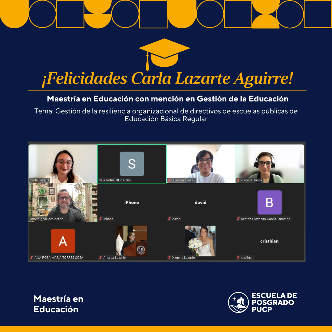 Felicitamos a la Srta. Carla Lazarte Aguirre por haberse graduado de Maestra en Educación con mención en Gestión de la Educación. Ella defendió la tesis titulada “Gestión de la resiliencia organizacional de directivos de escuelas públicas de Educación Básica Regular.”