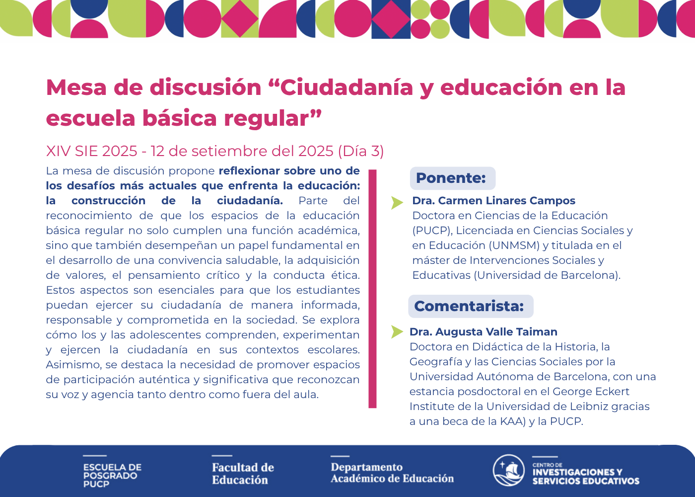 lunes, 8 de septiembre 2025 XIV SIE-CISE | Carmen Linares, graduada del Doctorado en Ciencias de la Educación, presentará la investigación de su tesis [Visto: 305 veces] Puntuación: 0 / Votos: 0
