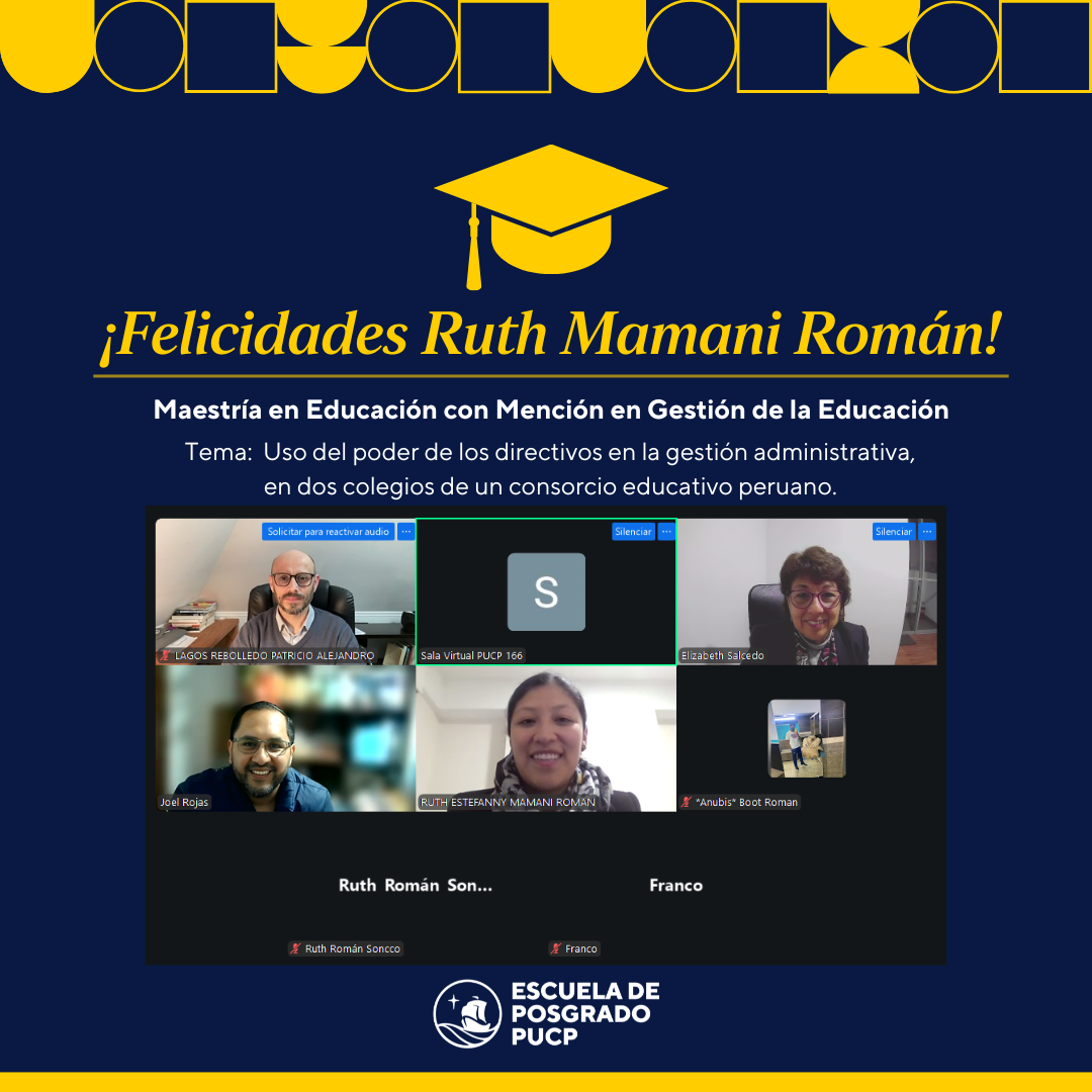 Felicitamos a la Srta. Ruth Mamani Román por haberse graduado de Maestra en Educación con mención en Gestión de la Educación. Ella defendió la tesis titulada “Uso del poder de los directivos en la gestión administrativa, en dos colegios de un consorcio educativo peruano.”