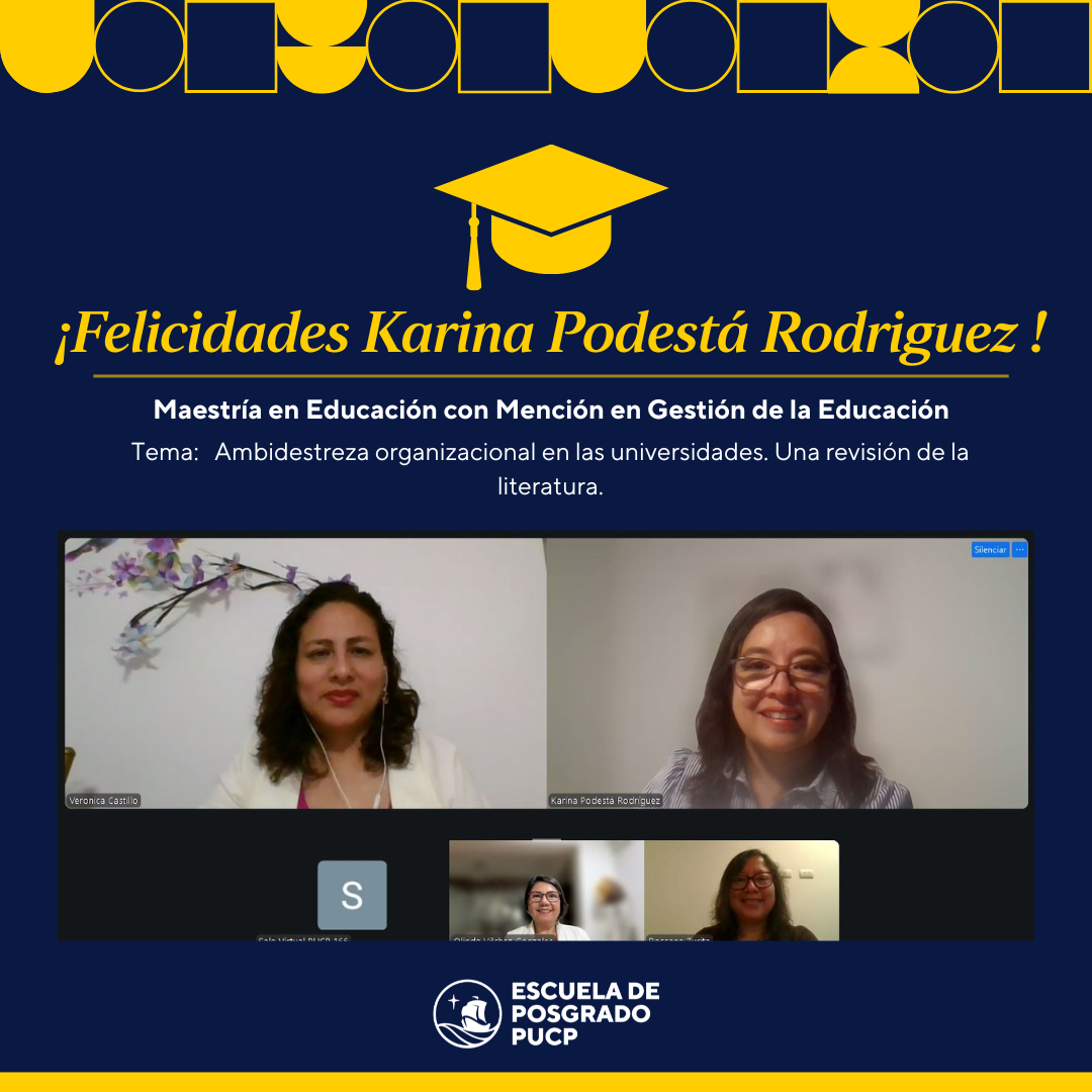 Felicitamos a la Srta. Karina Podestá Rodríguez por haberse graduado de Maestra en Educación con mención en Gestión de la Educación. Ella defendió la tesis titulada “Ambidestreza organizacional en las universidades. Una revisión de la literatura.”