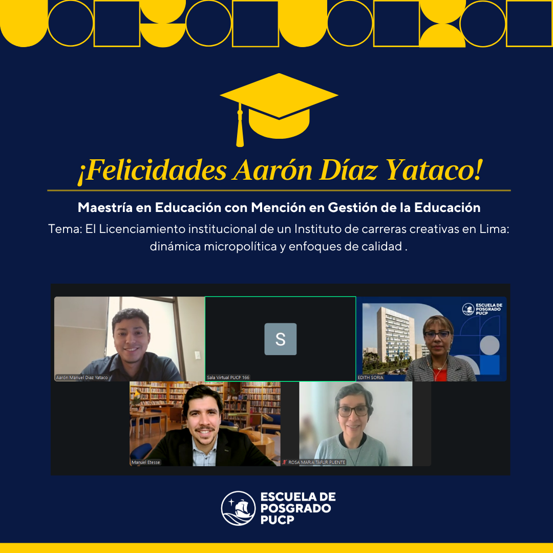 Felicitamos al Sr. Aaron Díaz Yataco por haberse graduado de Maestro en Educación con mención en Gestión de la Educación. ÉL defendió la tesis titulada “El Licenciamiento institucional de un Instituto de carreras creativas en Lima: dinámica micropolítica y enfoques de calidad.”