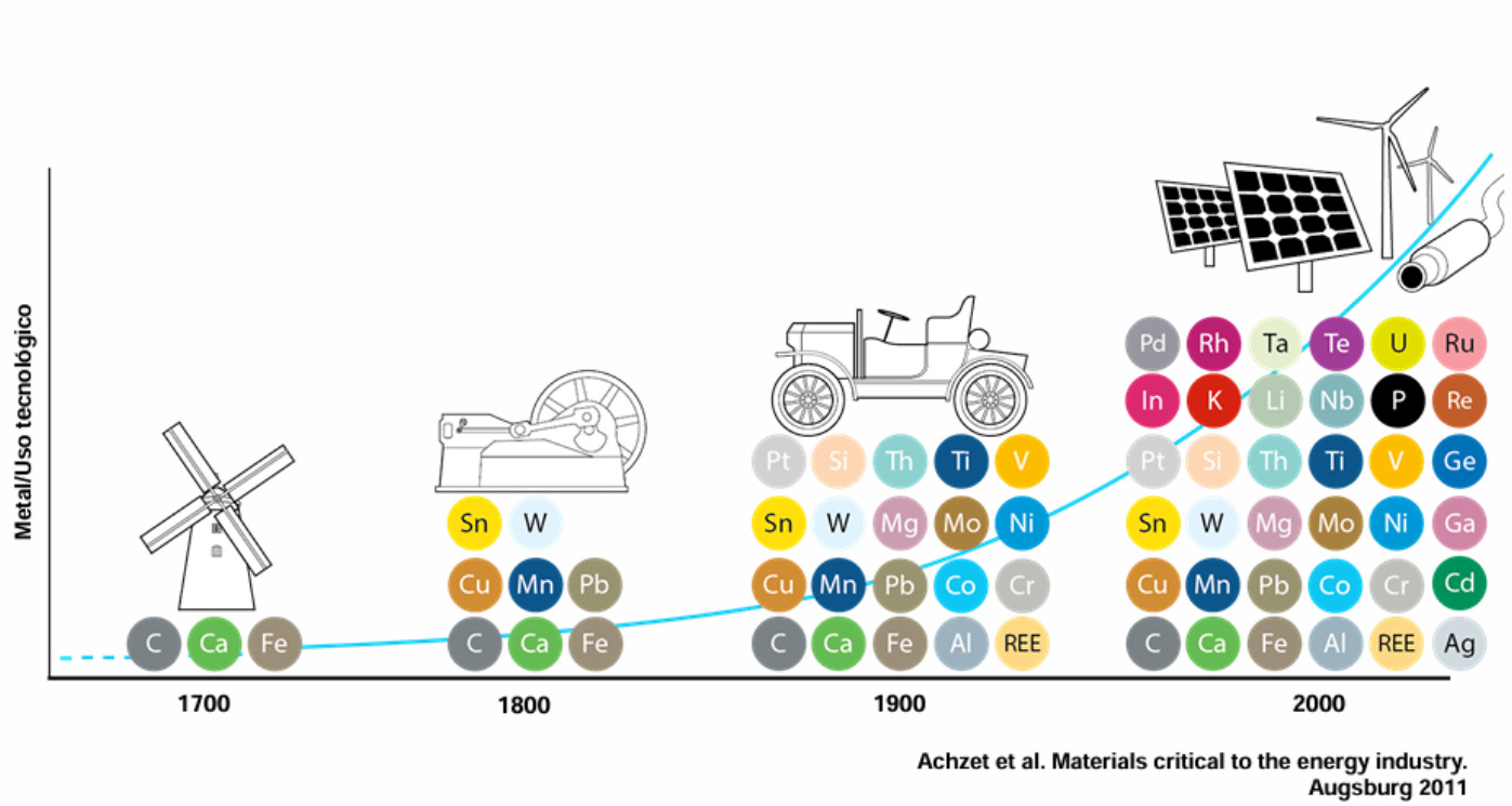 Figura 4. Uso de metales a lo largo del tiempo. Recuperado de Zepf, V. et al (2014). Materials critical to the energy industry: an introduction. BP plc